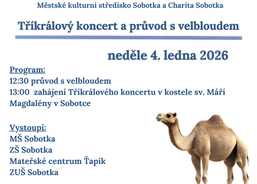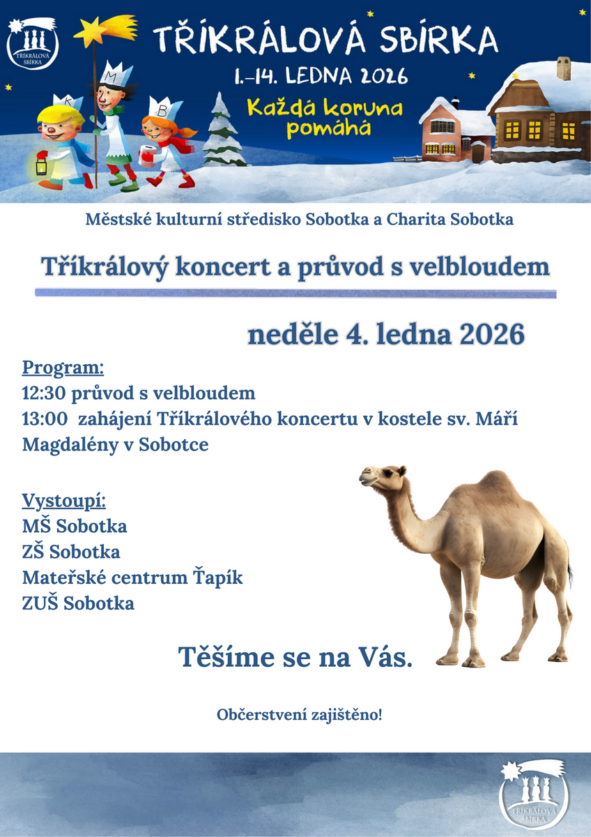 Srdečně Vás zveme na Tříkrálový koncert, který se uskuteční 4.1.2026. Program začíná od 12:30 hod. u kostela sv. Máří Magdalény v Sobotce. Těšíme se na Vás